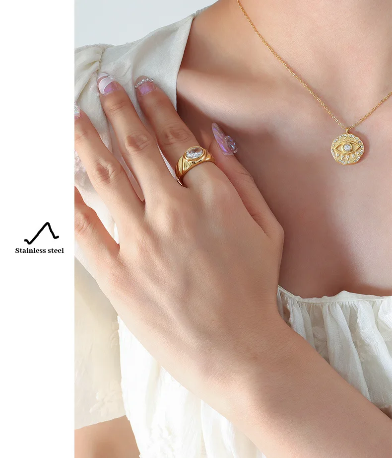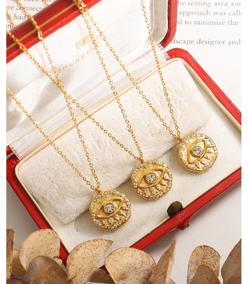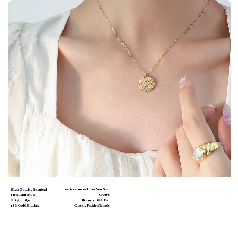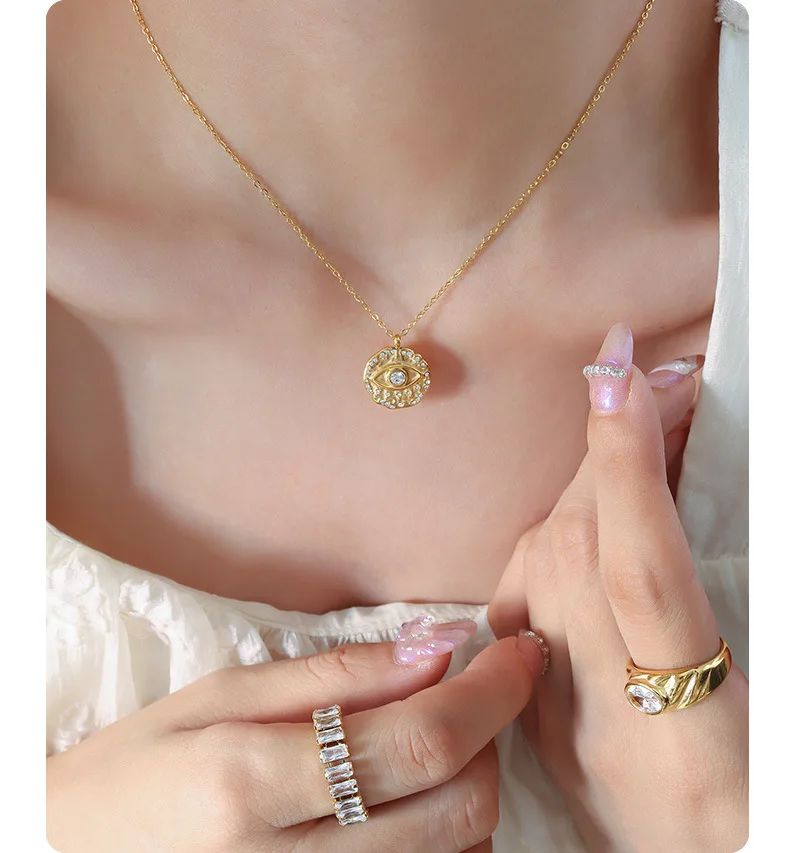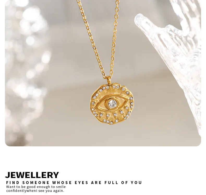 2022 new stainless steel 18K gold temperament hip-hop evil eye inlaid zircon irregular round pendant necklace