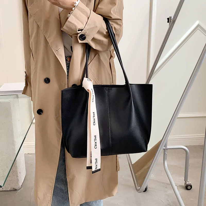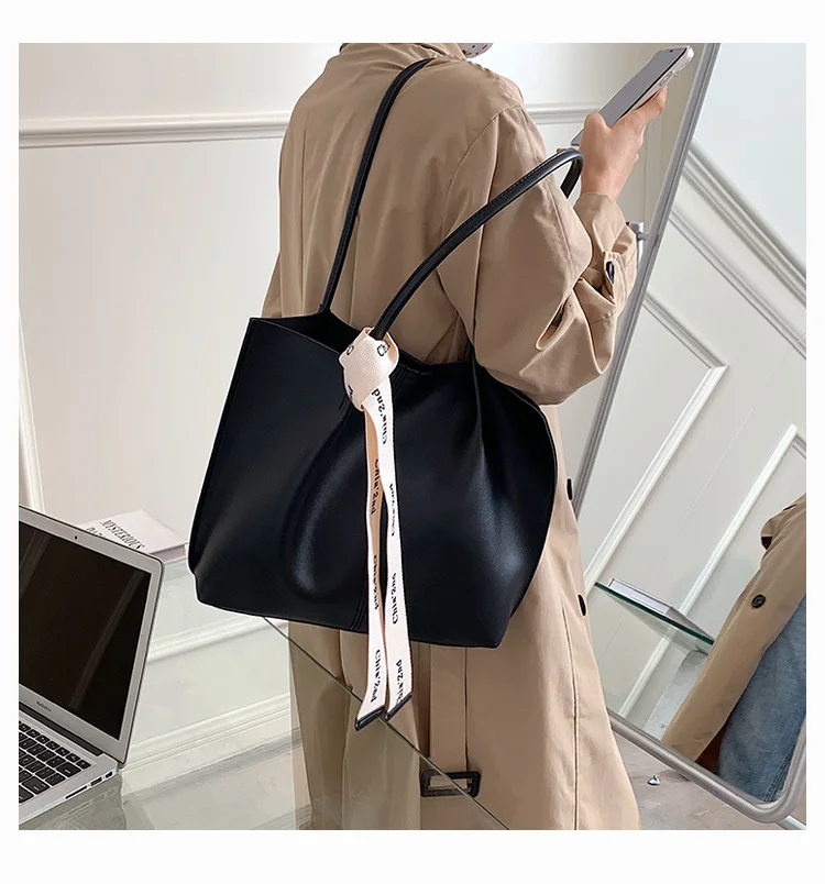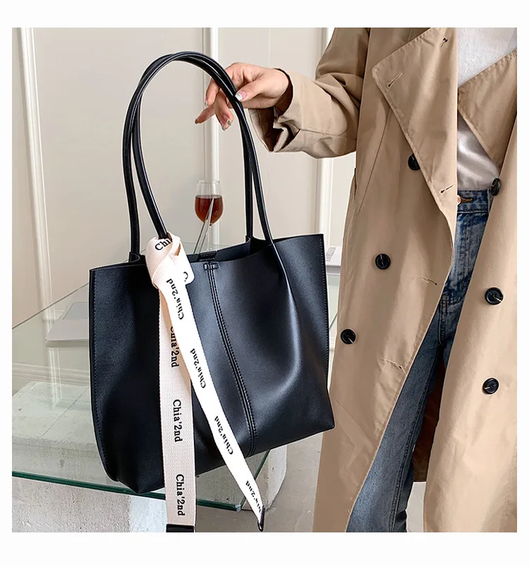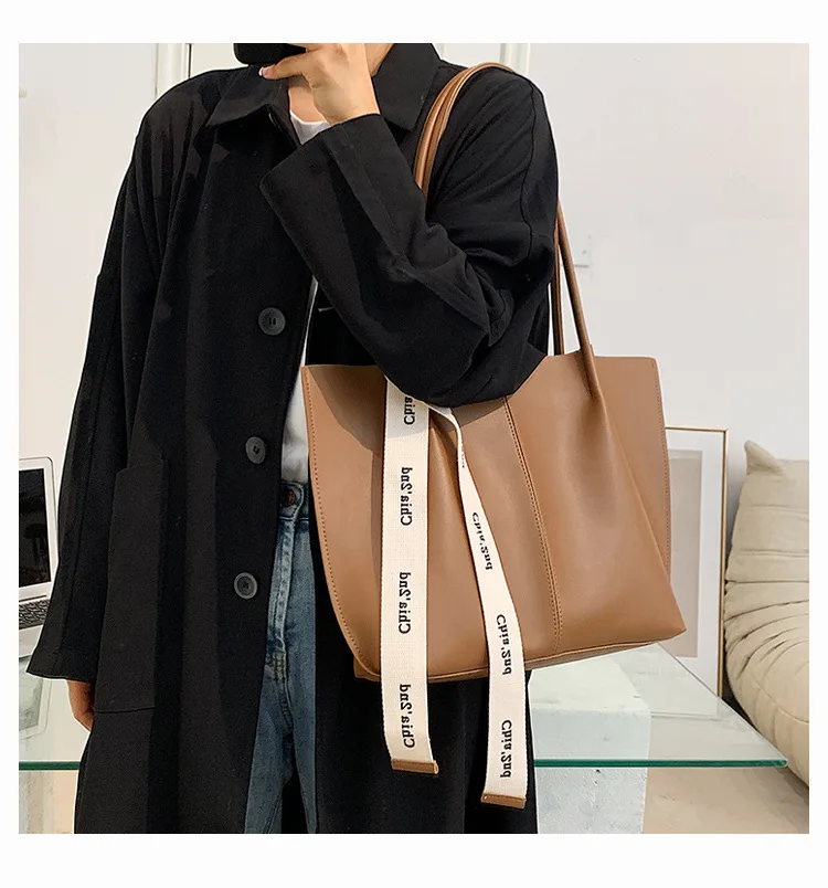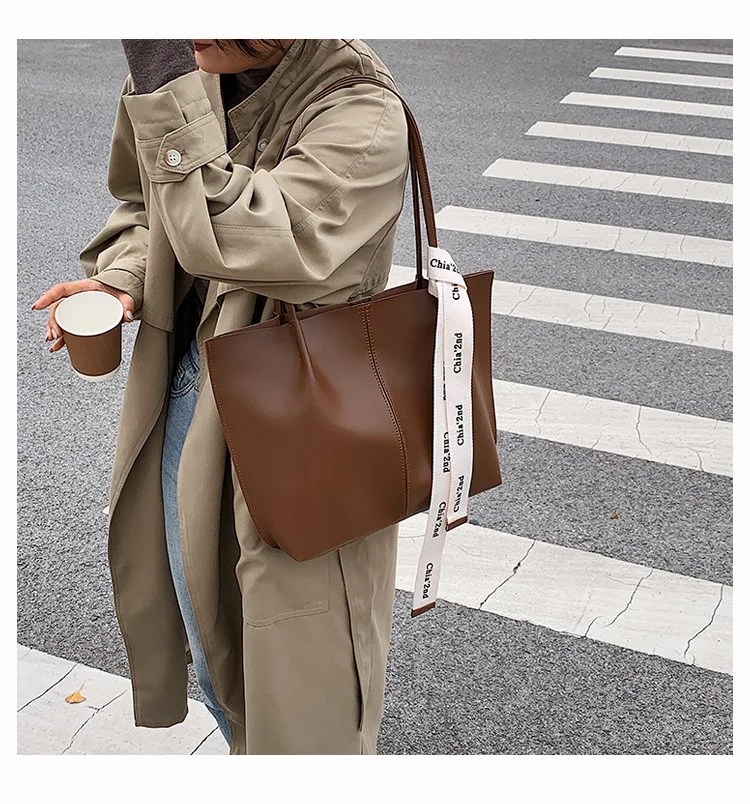 2023 Wholesale Pu Leather tote Bag Women vintage Handbag Lady Big Khaki Bag with ribbon