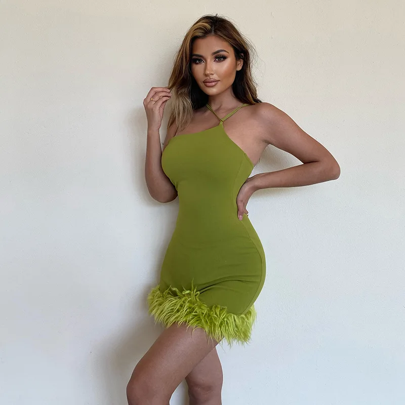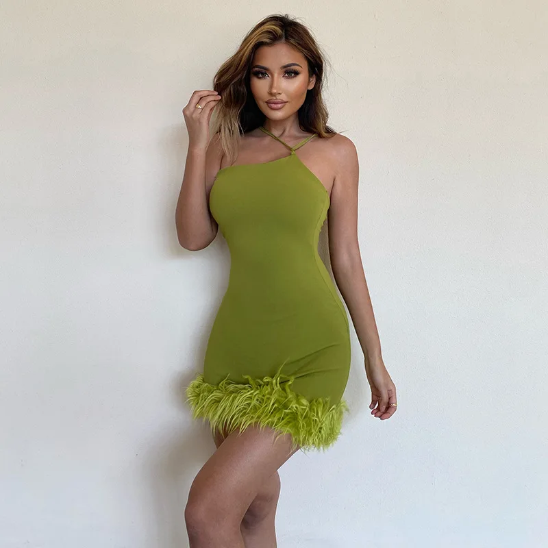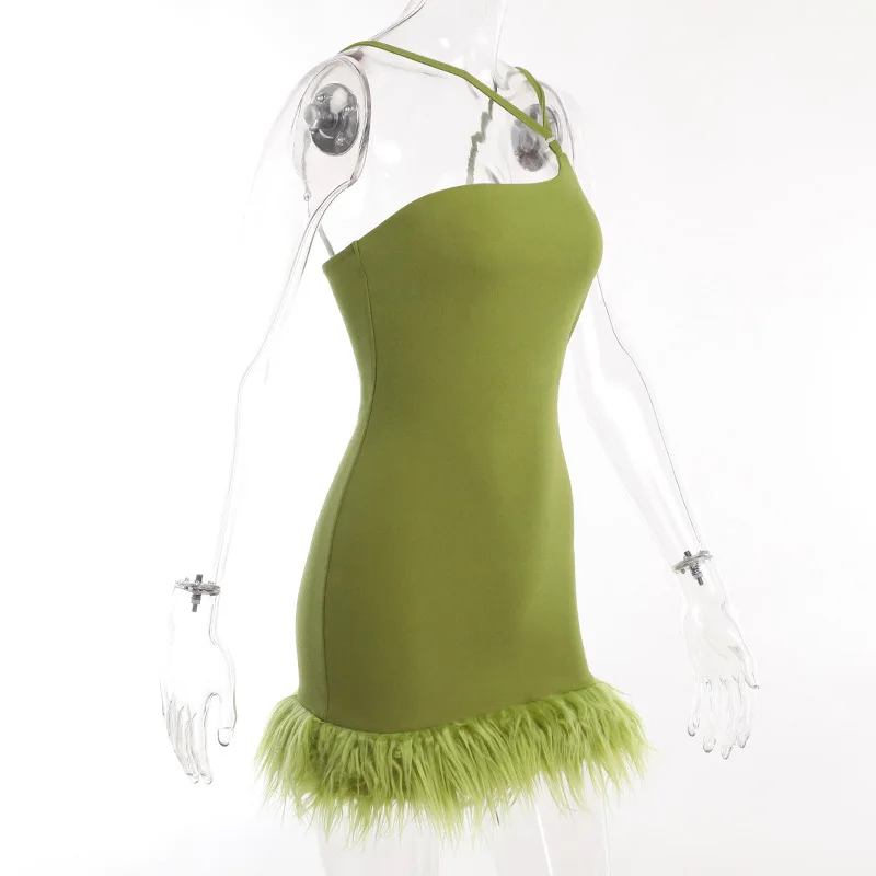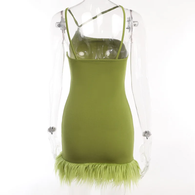 3037 One Shoulder Hollow Out Feather Tassel Solid Mini Elegant Women'S Dresses 2023 Summer Evening Party Club American Clothing