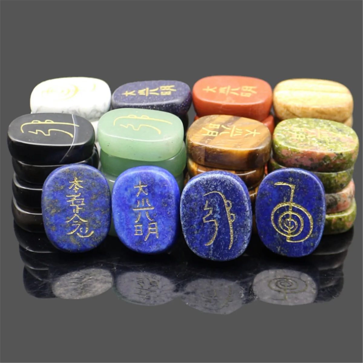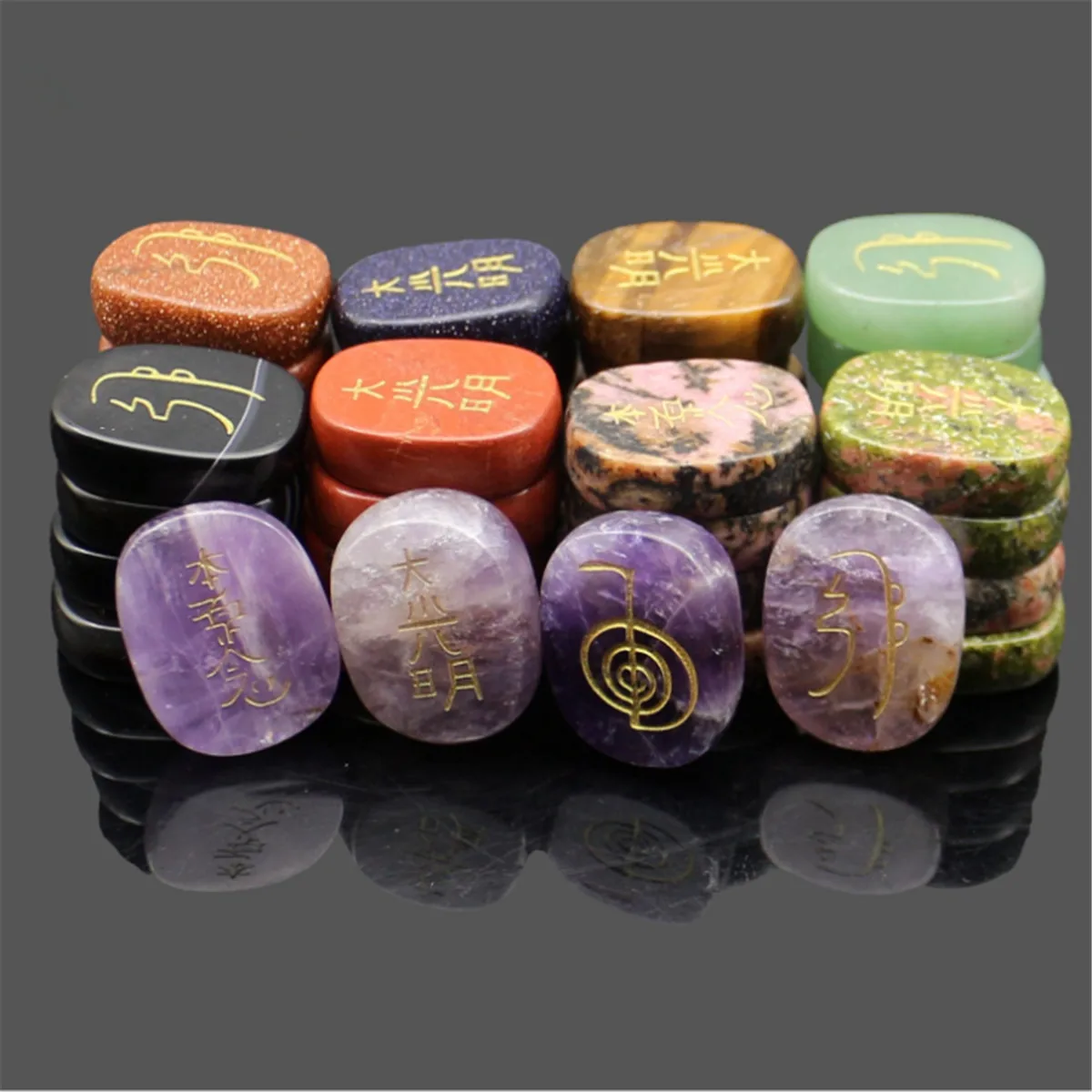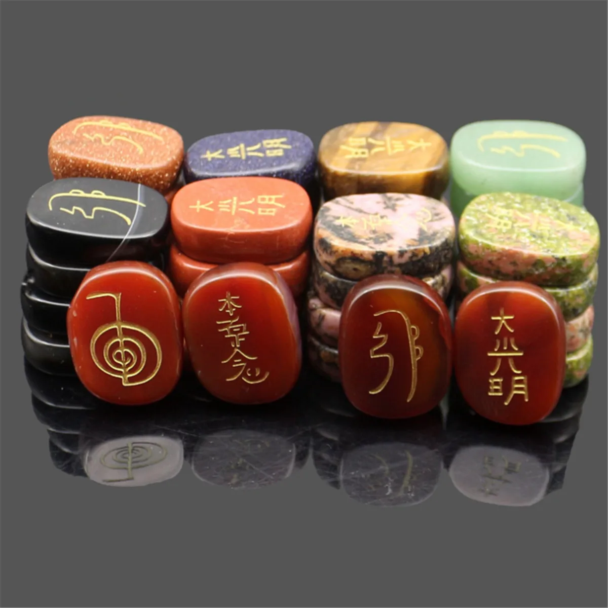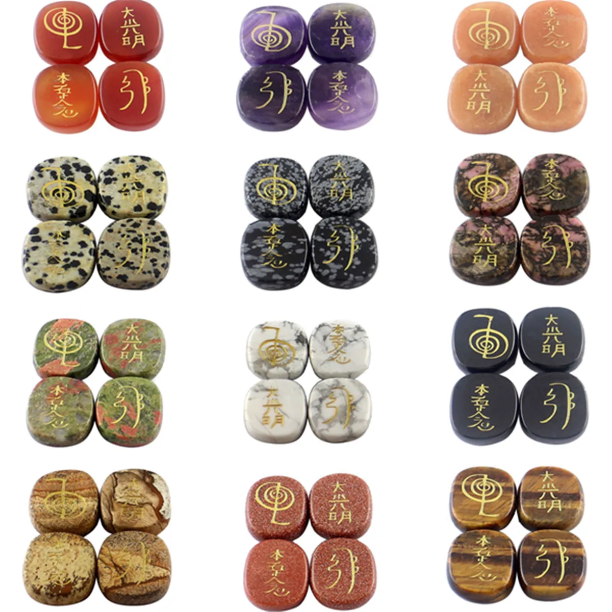 Package Included:1 Set (4 Pcs) Engraved Usui Reiki Symbol Healing Energy Sanskrit Palm Crystal Stone