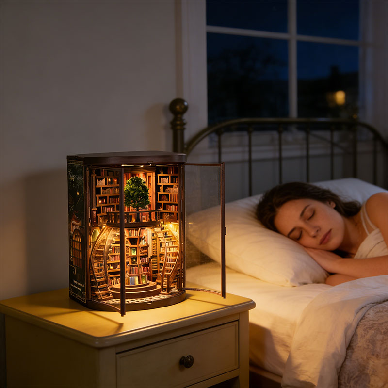 Product Type: A DIY wooden miniature kit to assemble a decorative "Book Nook" bookend for shelf or desk display.