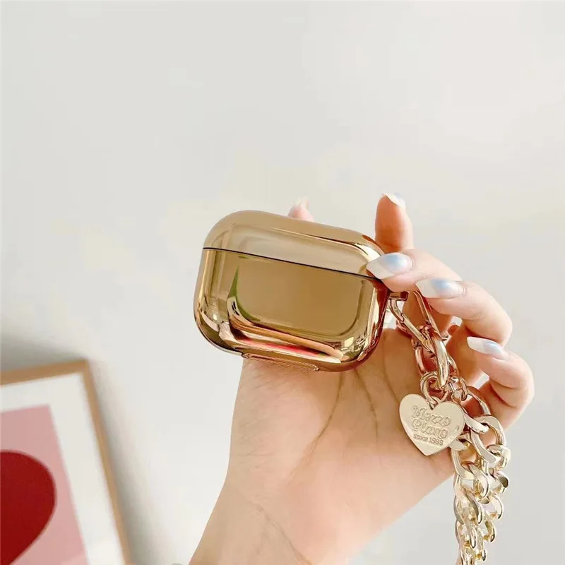 Gold Electroplating Love Heart Gold Chain Case for Apple Airpods Wireless Earphone Plating Cover for AirPods Pro 1 2 3 Generation Protective Case