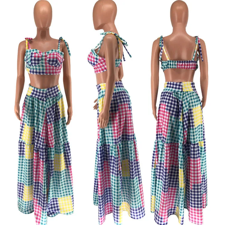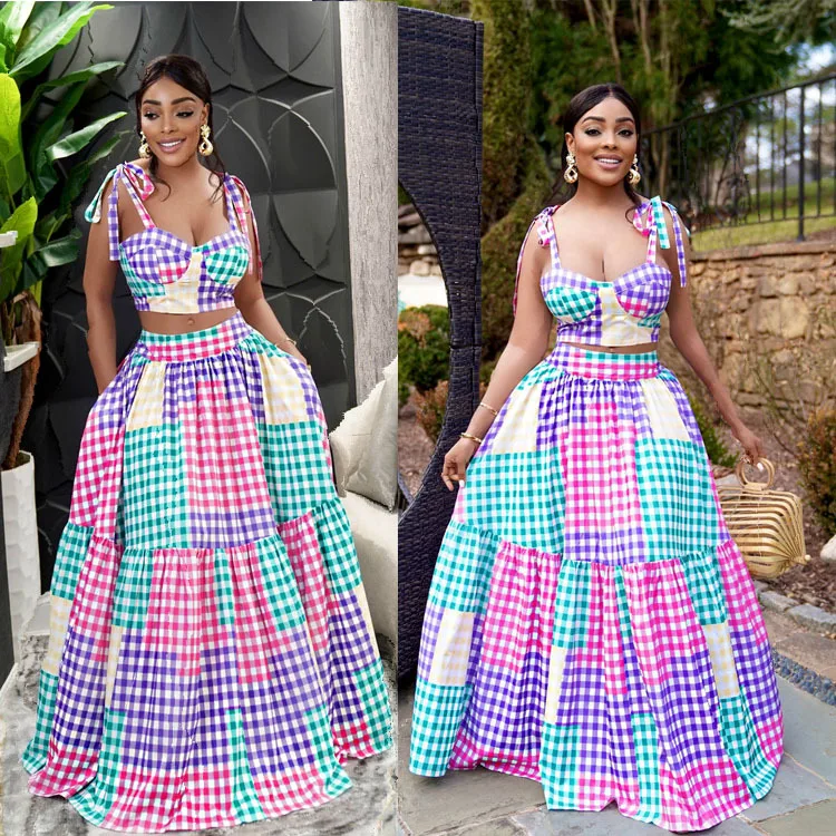 GX8833 Elegant Two 2 Piece Set Women Colorful Plaid Maxi Long Big Swing Dress Pink Ladies Formal Skirt Suit