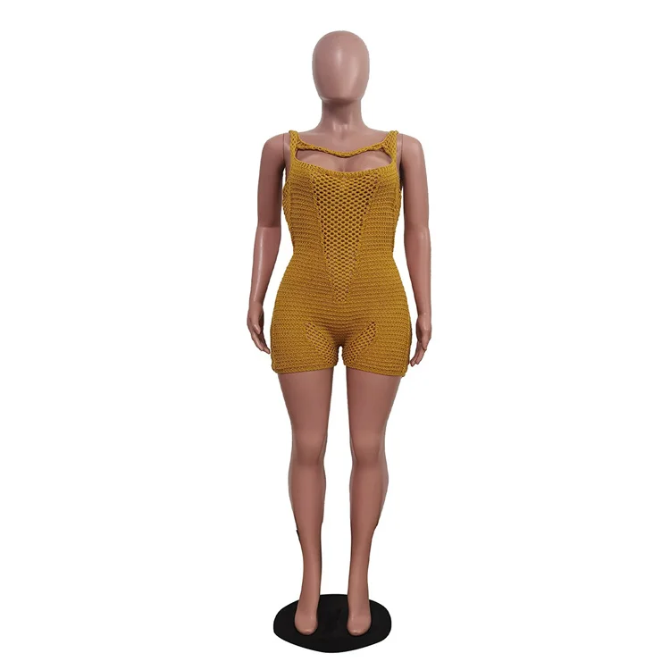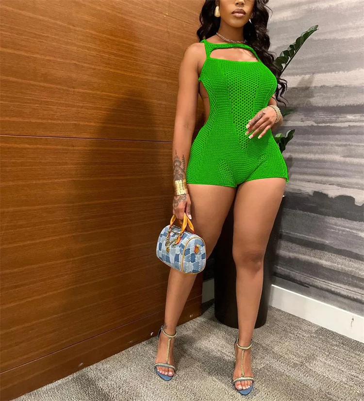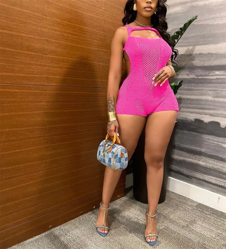 Knitted Hollow Out Playsuits Women Sexy O-Neck Backless Body-Shaping Rompers Summer 2024 Fashion One Piece Streetwear