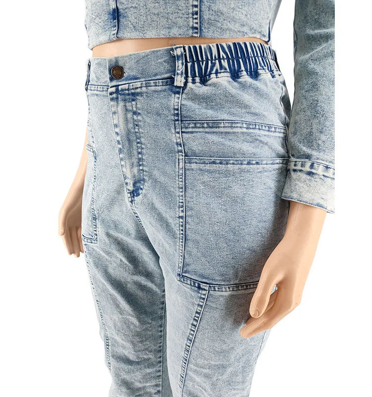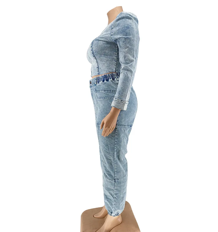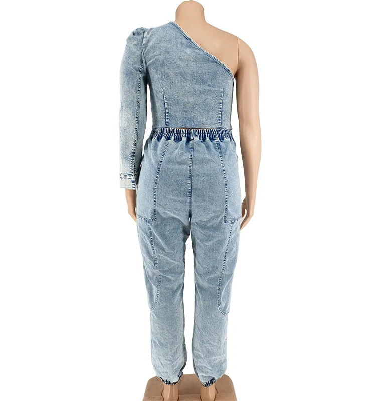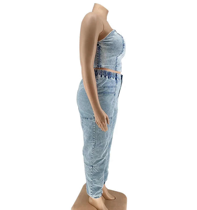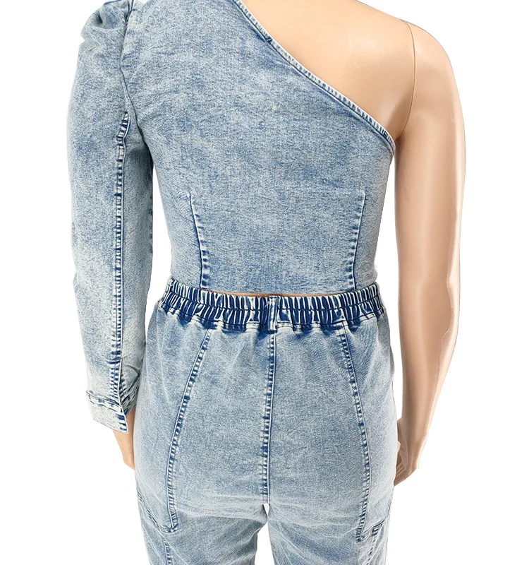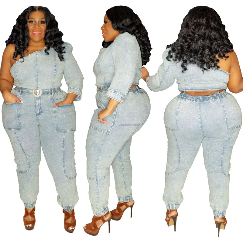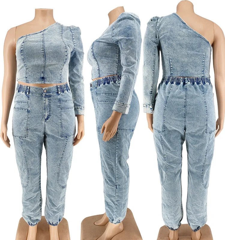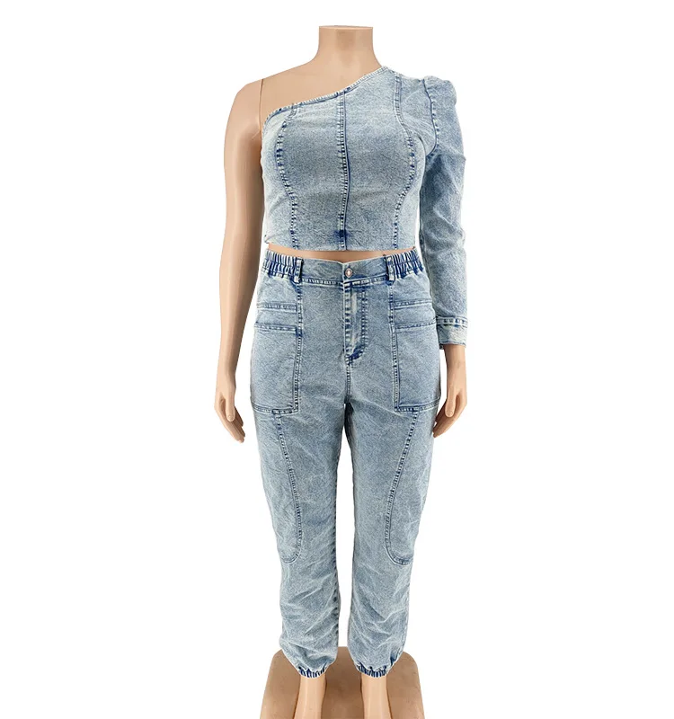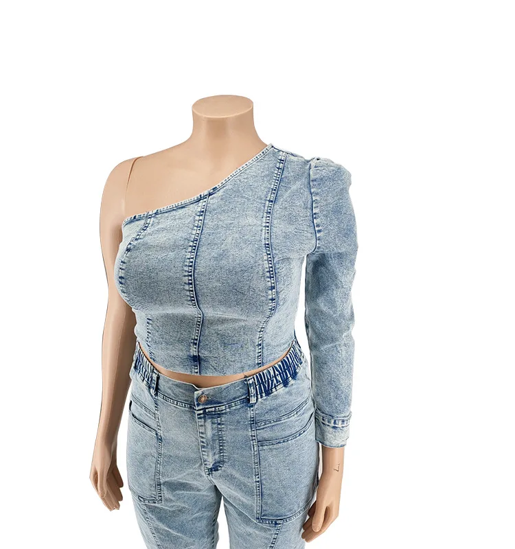 Latest denim 2 piece set women slant shoulder single sleeve denim top 2 piece jean set large size denim jean two piece sets