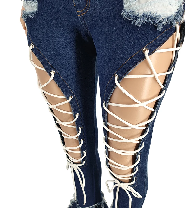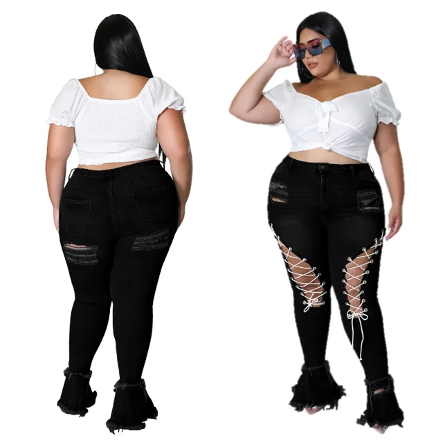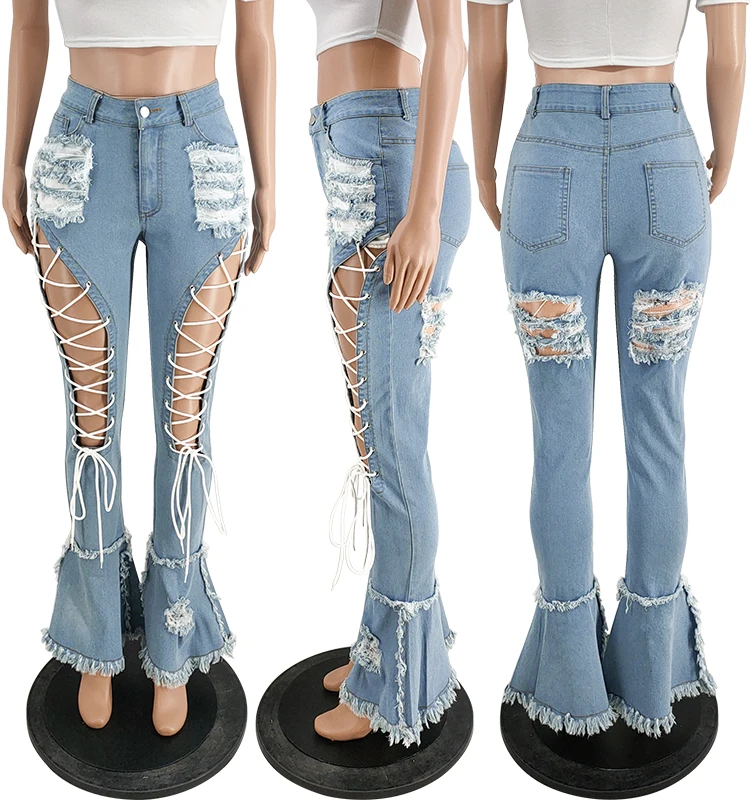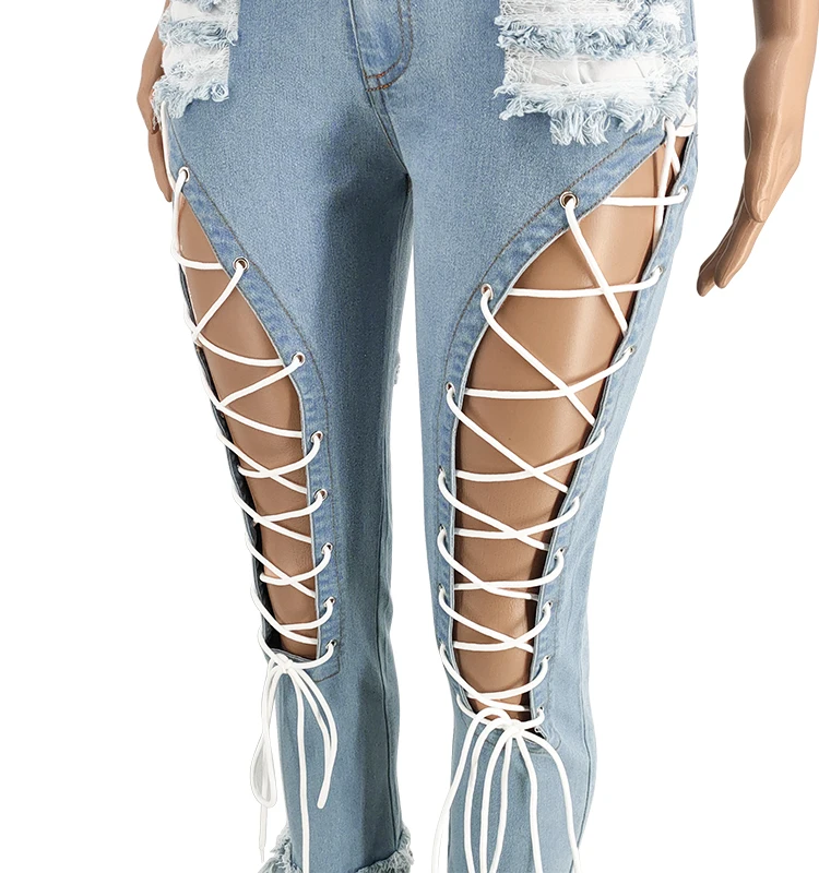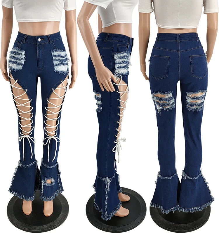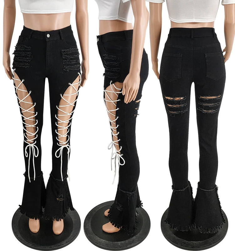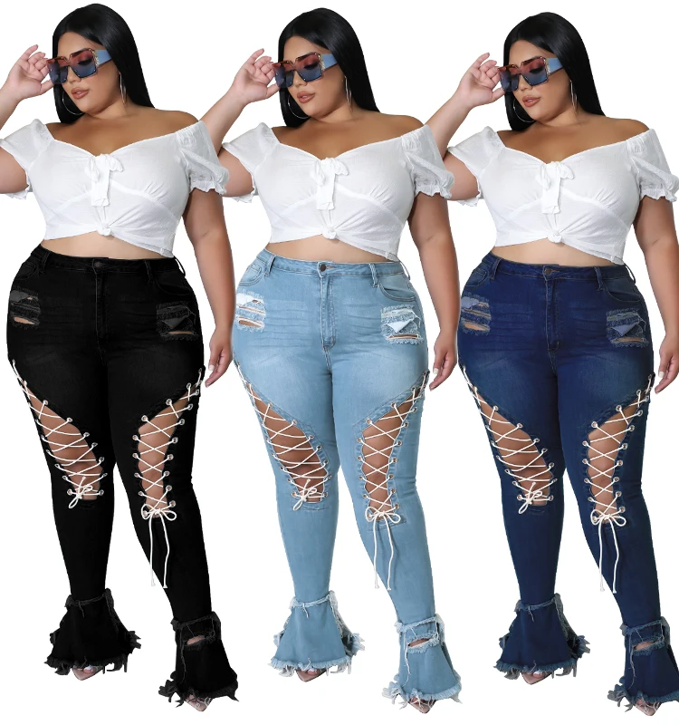 New Arrival S-5XL Stretchy Denim Jeans For Oversize Women Hollow Out Bandage Flare Pants Fashion Street Wear Plus Size Lady Jeans