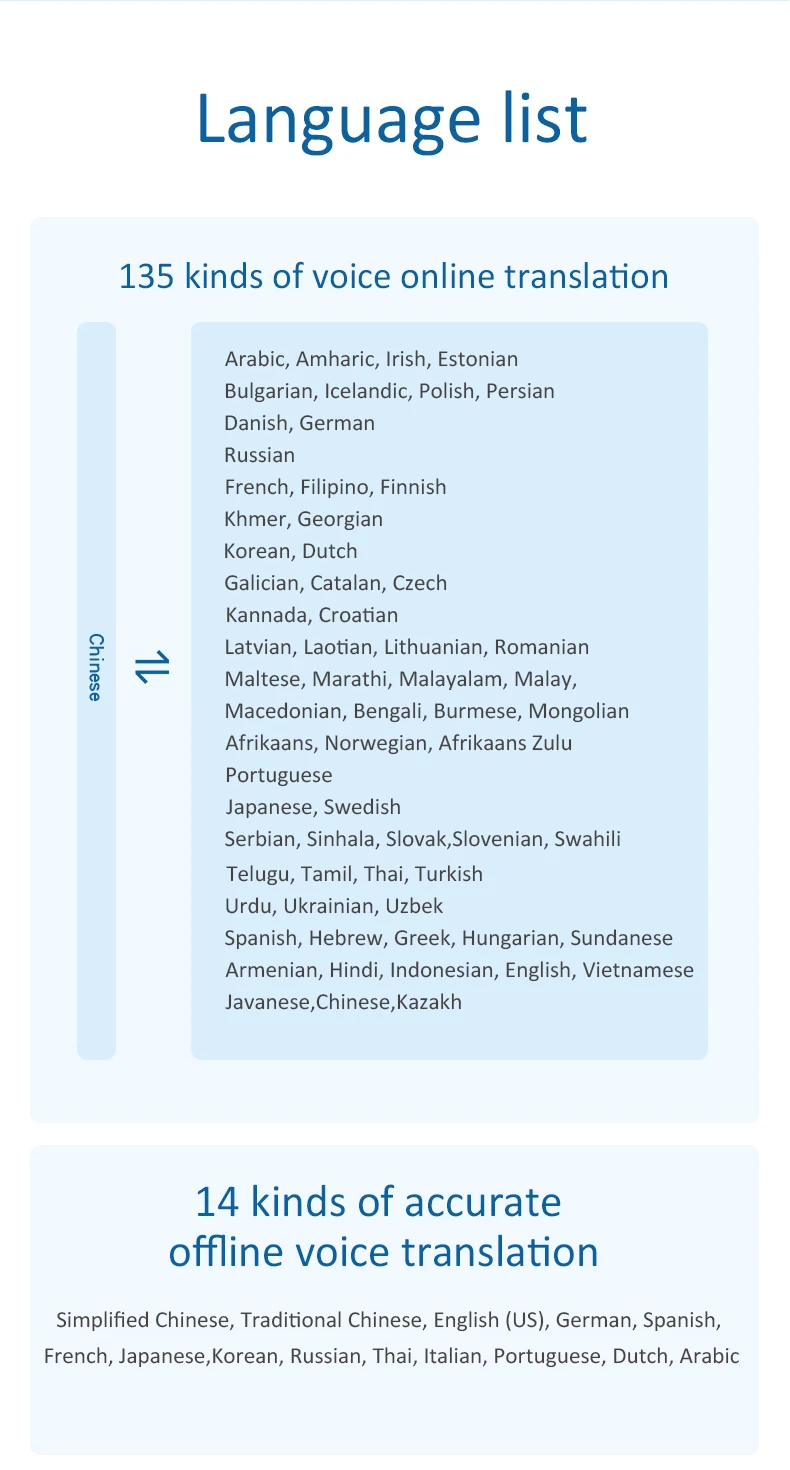 138 Online languages (74 languages & 70 accents), 14 offline languages