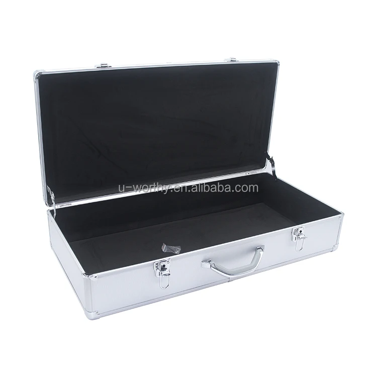 Metal corner protectors, metal lock with key, padded metal handle, pull rod, hinges on the backside, shoulder strap;