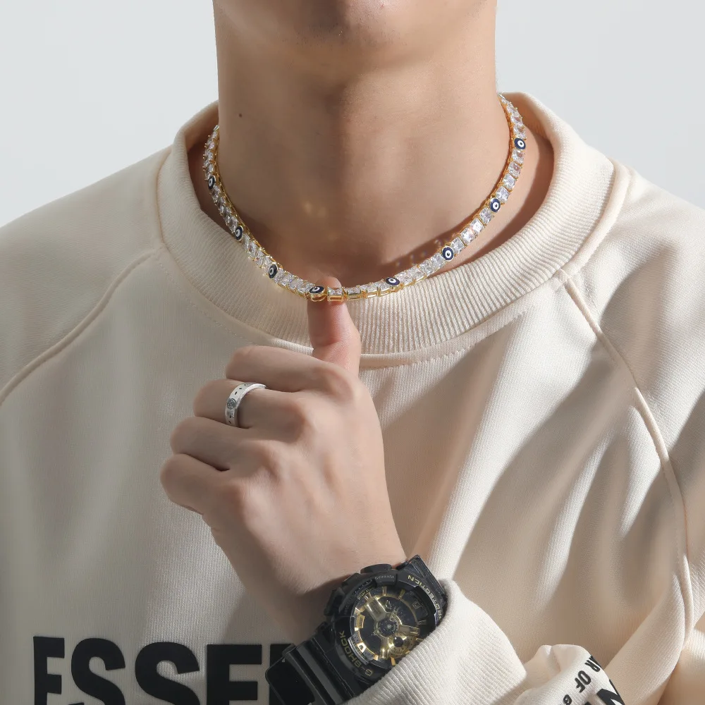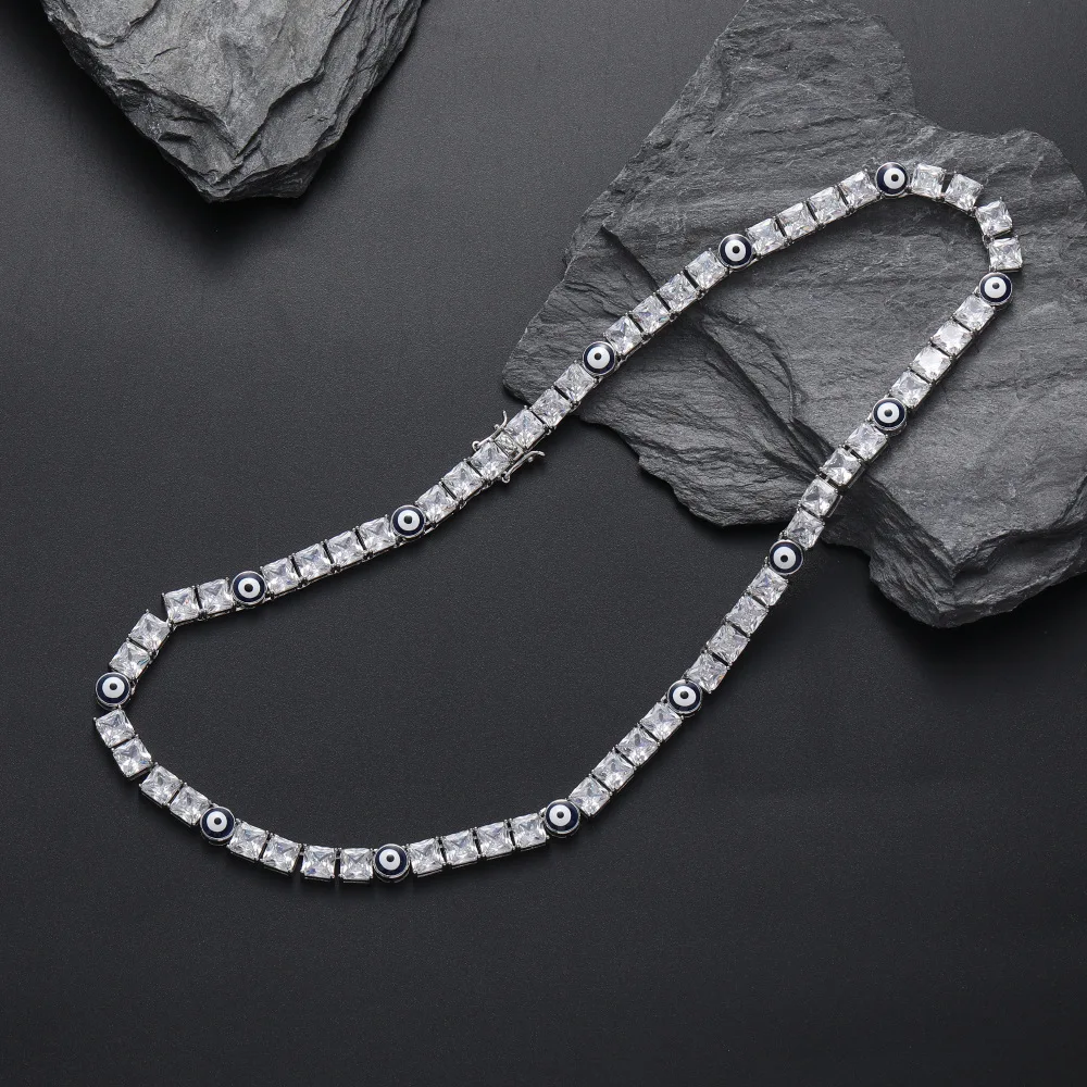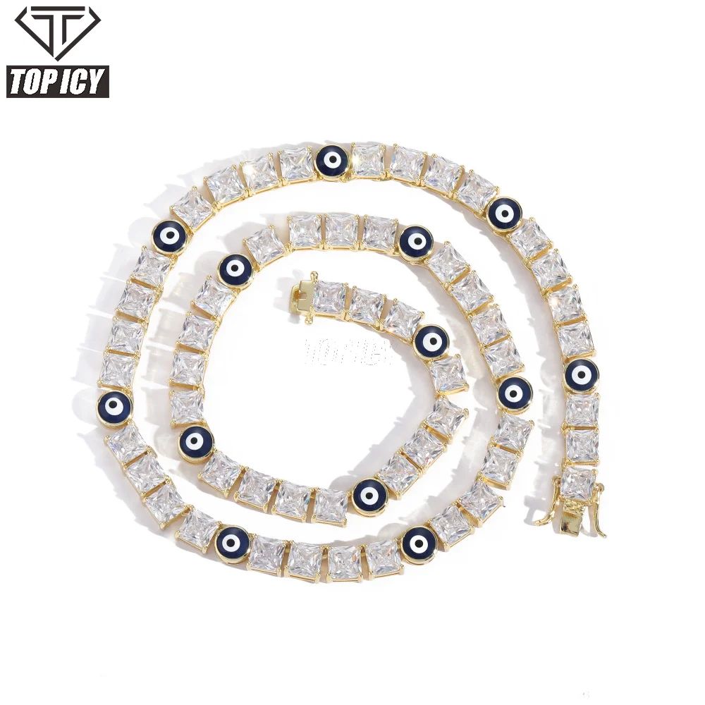 TOP ICY Hip Hop 18k Gold Plated Evil Blue Eye CZ Diamond Necklace Iced Out 6mm Tennis Chain Jewelry