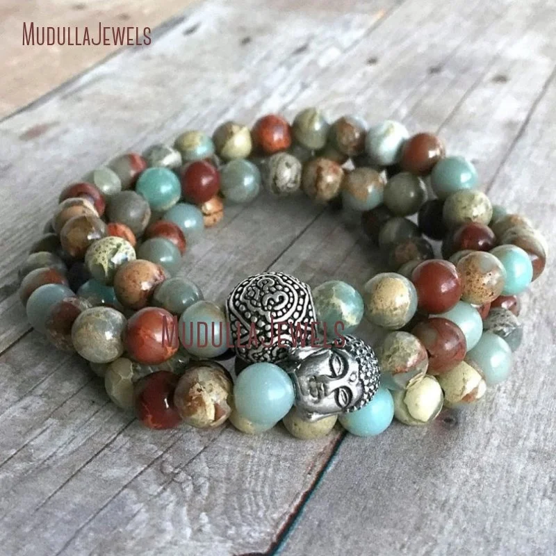 WMB18357 African Opal Beads 108 Mala Bracelet or Necklace Sterling Silver Buddha Yoga Bracelet Jasper Wrist Mala